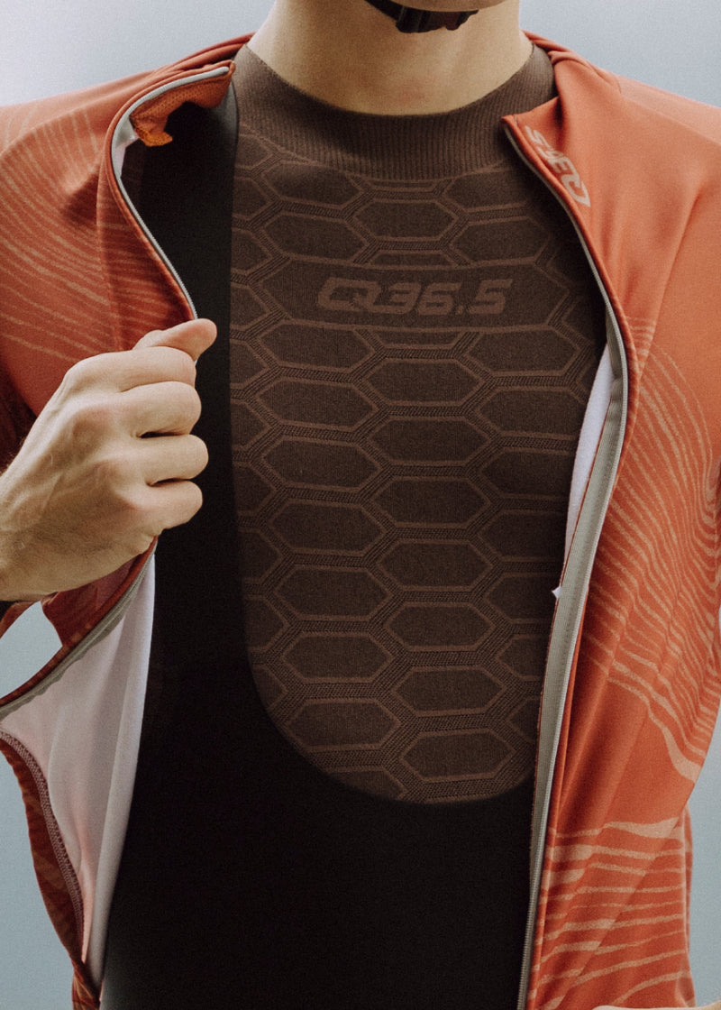 Q36.5's Unisex Short Sleeve Base Layer 2 is highly elastic, durable, and ultra-lightweight. Constructed with minimal seams, this brown base layer features a honey-comb knit pattern with open-mesh sections that map the athlete’s body while thermoregulating and stabilizing body temperature.
