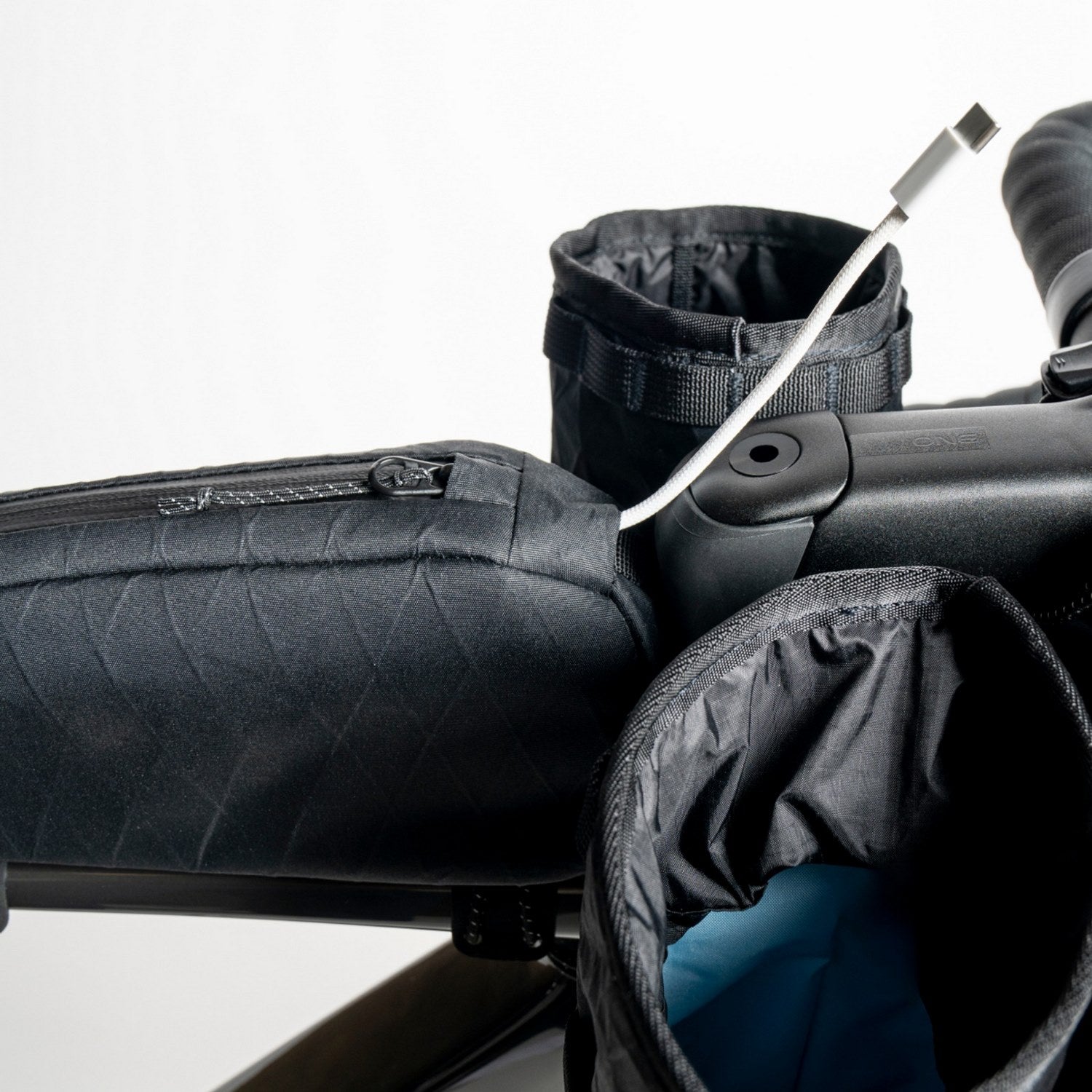 Crafted from waterproof and highly durable X-Pac RX15 fabric, this bag withstands year-round conditions. Dual internal mesh pockets help organize smaller items, while a cable pass-through supports external battery use. One-handed zipper access and elastic top tube fasteners make on-the-go use a breeze, while reflective thread details keep visibility high in low light.